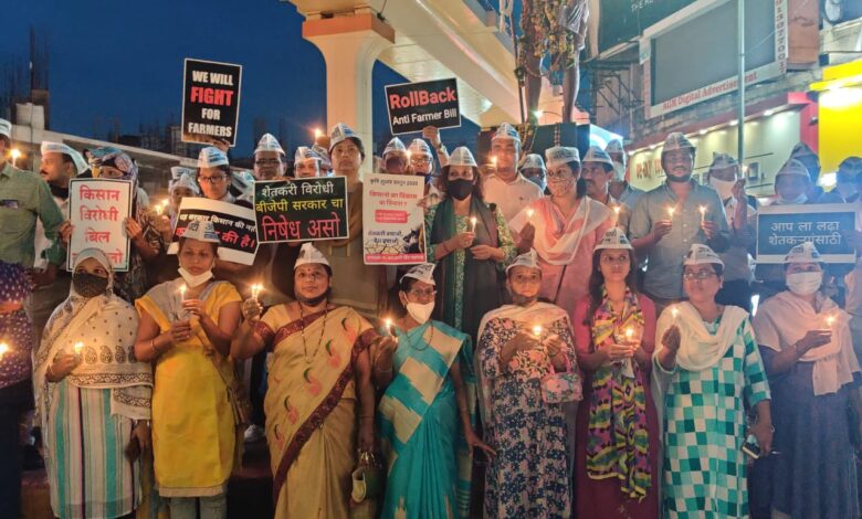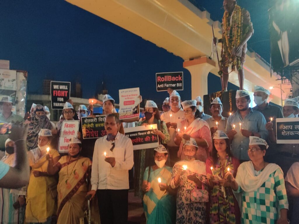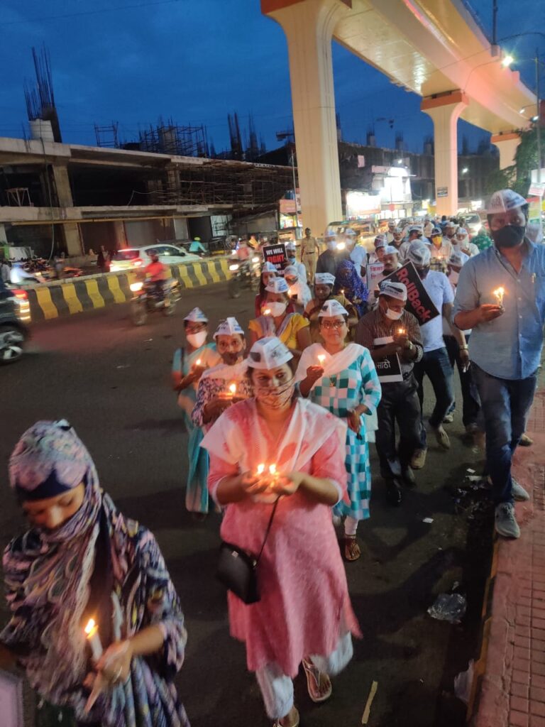आम आदमी पार्टी कडून लखीमपूर खिरी येथिल हत्याकांडाचा निषेध व शहीद झालेल्या शेतकऱ्यांना कैंडल मार्च काढून श्रद्धांजली