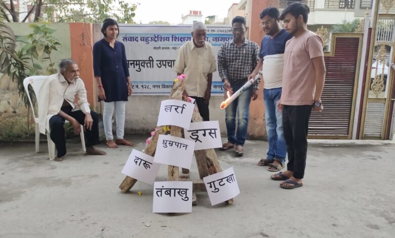 त्याचप्रमाणे या वर्षी होळी या सणा निमीत्त संवाद बहुउद्देशीय शिक्षण संस्था, नागपुर कार्यकारणी मंडळाने व्यसनाधीन लोकांसाठी जनजागृती व्हावी या दृष्टीेकोनातून उद्देश्याने होळी मध्ये तंबाखू , गुटखा, खऱ्या, पान-पुडी , दारू बॉटल, व अन्य नशा आम्ली पदार्थ चे ज्वलन करून व्यसना विरोधी संस्था द्वारा समजा मध्ये जनजागृती करण्यात आली.