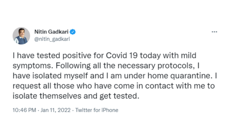 केंद्रीय मंत्री नितिन गडकरी का कोरोना टेस्ट पॉजिटिव आया है. इस बात की जानकारी उन्होंने ट्विटर पर दी है। उन्होंने कहा, ‘मैंने आज हल्के लक्षणों के साथ कोरोना पॉजिटिव पाया है। मैंने सभी जरूरी प्रोटोकॉल का पालन करते हुए खुद को आइसोलेट कर लिया है। मैं इस समय होम क्वारंटाइन में हूं। मैं उन सभी से आग्रह करता हूं जो मेरे संपर्क में आते हैं और खुद को अलग करने और परीक्षण करने का आग्रह करते हैं।